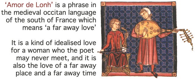 Amor de Lonh is a phrase in the medieval language of the South of France (occitan) which means ‘far away love.’ It is a kind of idealised love for a woman who the poet may never meet, and it is also the love of a far away place and a far away time.